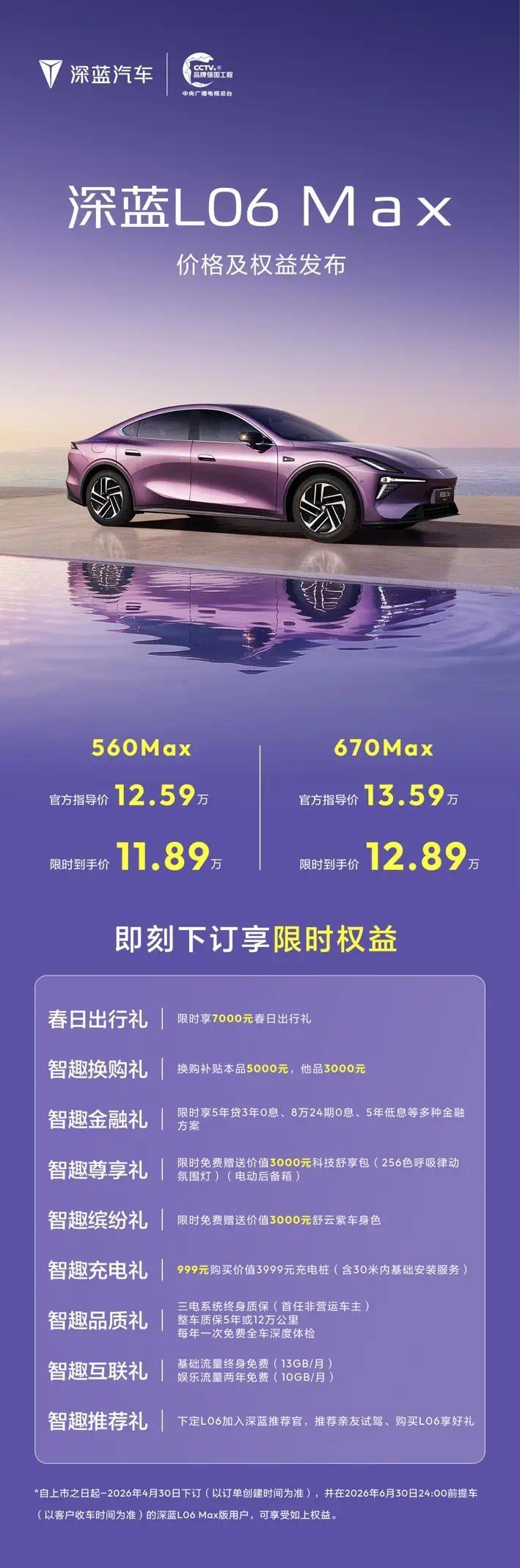深蓝 L06 Max 分 560Max 和 670Max 两款配置。其中,560Max 配置官方指导价 12.59 万元,限时到手价 11.89 万元;670Max 配置官方指导价 13.59 万元,限时到手价 12.89 万元。